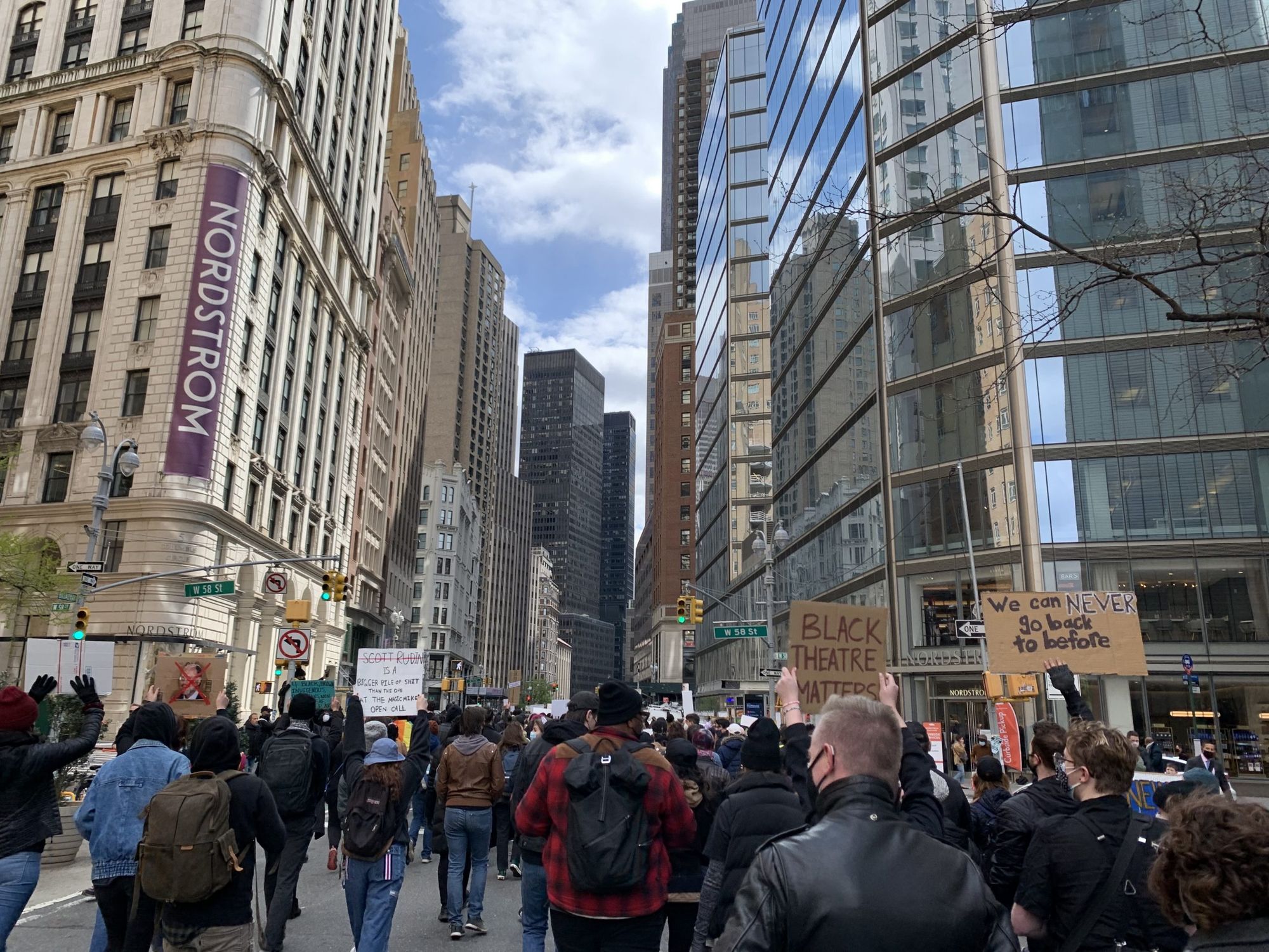 As they walked, marchers held signs such reading “No News, No Dues,” referencing a social media campaign to withhold dues until the union provides greater transparency on its spending, as well as several featuring musical theater references like “We can never go back to before.” Rudin’s name made frequent appearances on signs and in chants, such as “Hey, hey, ho ho. Scott Rudin has got to go!”